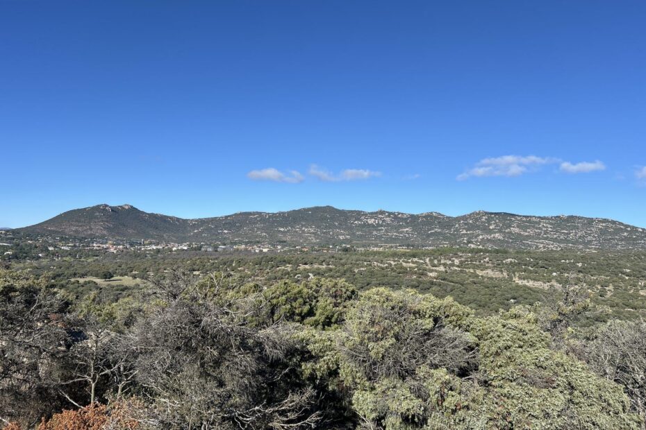 Continuamos por la pista ancha que pasa cerca de la carretera y nos lleva hasta la urbanización Las Colinas. A la entrada de la misma tomamos un camino en descenso que nos lleva de nuevo al Arroyo de Trofa. Cruzado este, continuamos ahora en ascenso hasta llegar al camino de El Pardo, en el paraje del Cierro Trofa, que cruzaremos para continuar por una senda desde la que tenemos unas buenas vistas hacia Madrid y que nos lleva al alto de La Solana.